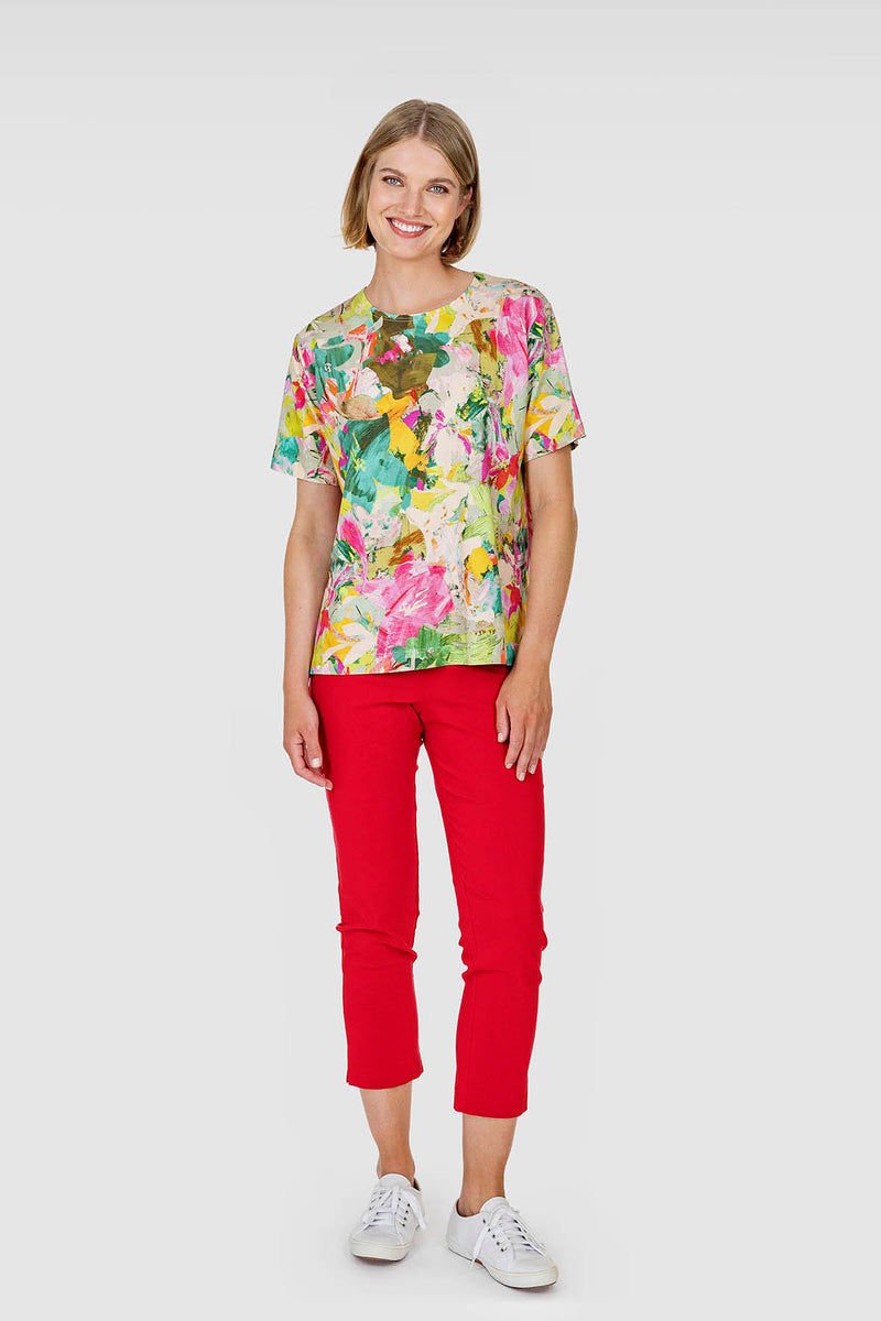 The perfectly slim fitting cropped red EEVA SLIT miracle trousers are made of stretchy viscose blend fabric. Easy to pull on, no zipper. Wide double waist panel gives extra support. Legs have slits on the side seam. EEVA SLIT trousers are designed in Finland and made in Lithuania.