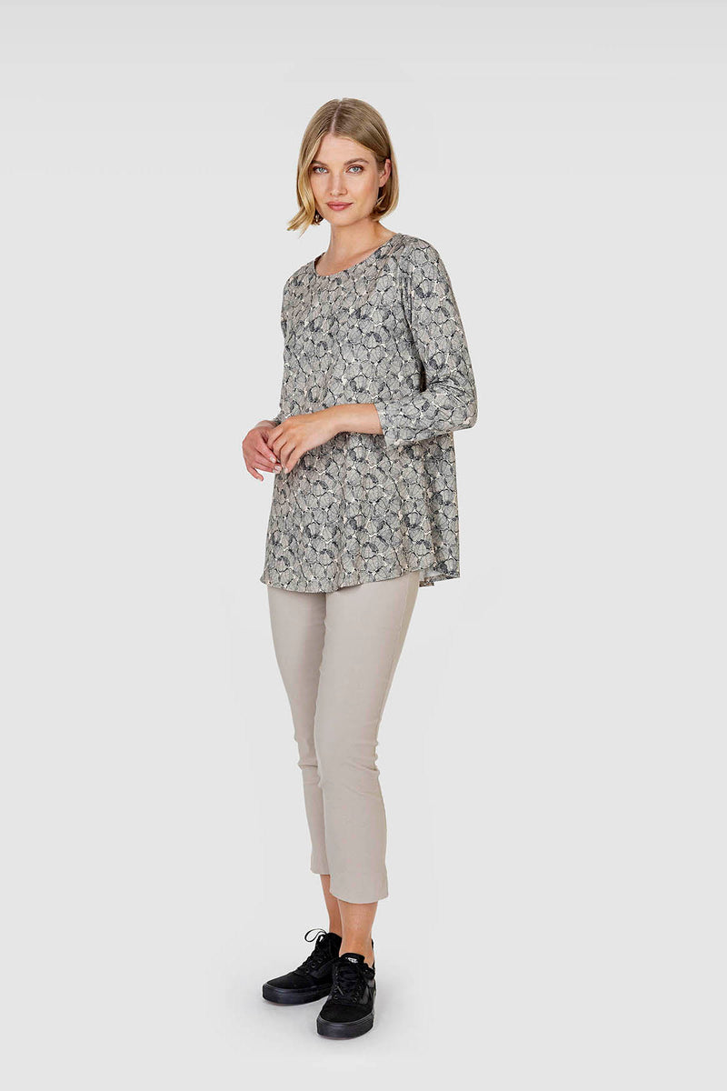 Perfectly slim fitting cropped beige EEVA SLIT miracle trousers are made of stretchy viscose blend fabric. Just pull on, no zipper. Wide double waist panel gives extra support. Legs have slits on the side seam. Designed in Finland and made in Estonia or Lithuania.