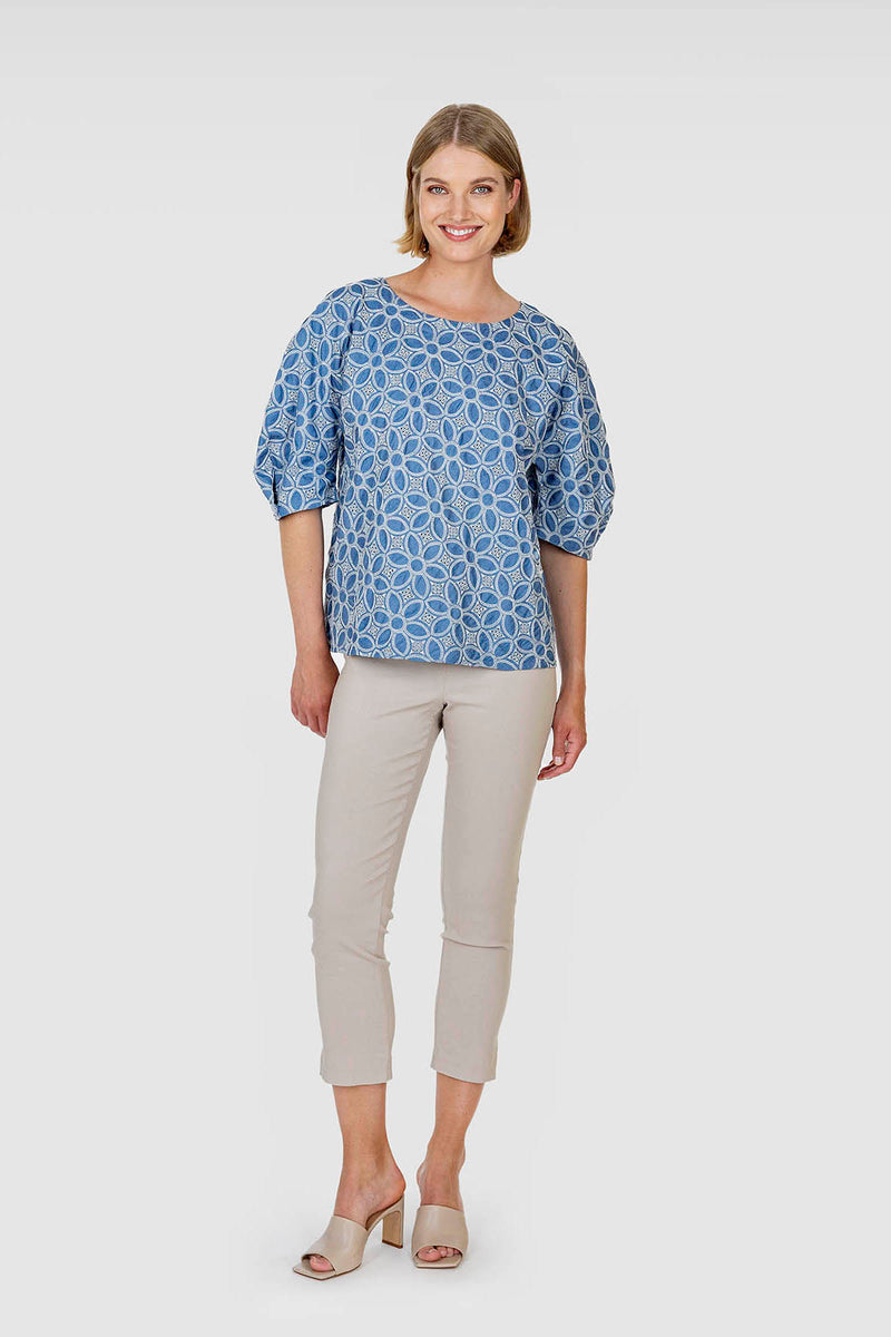 Perfectly slim fitting cropped beige EEVA SLIT miracle trousers are made of stretchy viscose blend fabric. Just pull on, no zipper. Wide double waist panel gives extra support. Legs have slits on the side seam. Designed in Finland and made in Lithuania.