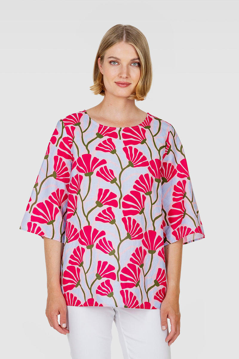 The summery KISSANKELLO top is slender on the shoulders and widens to the hem. It has elbow-length sleeves, a round neckline and a curved hem. It is made of beautifully draping printed linen-cotton fabric, the print featuring stylized summery flowers. The top is garment washed, so it does not shrink and feels comfortably soft. KISSANKELLO top is designed in Finland and made in Lithuania.