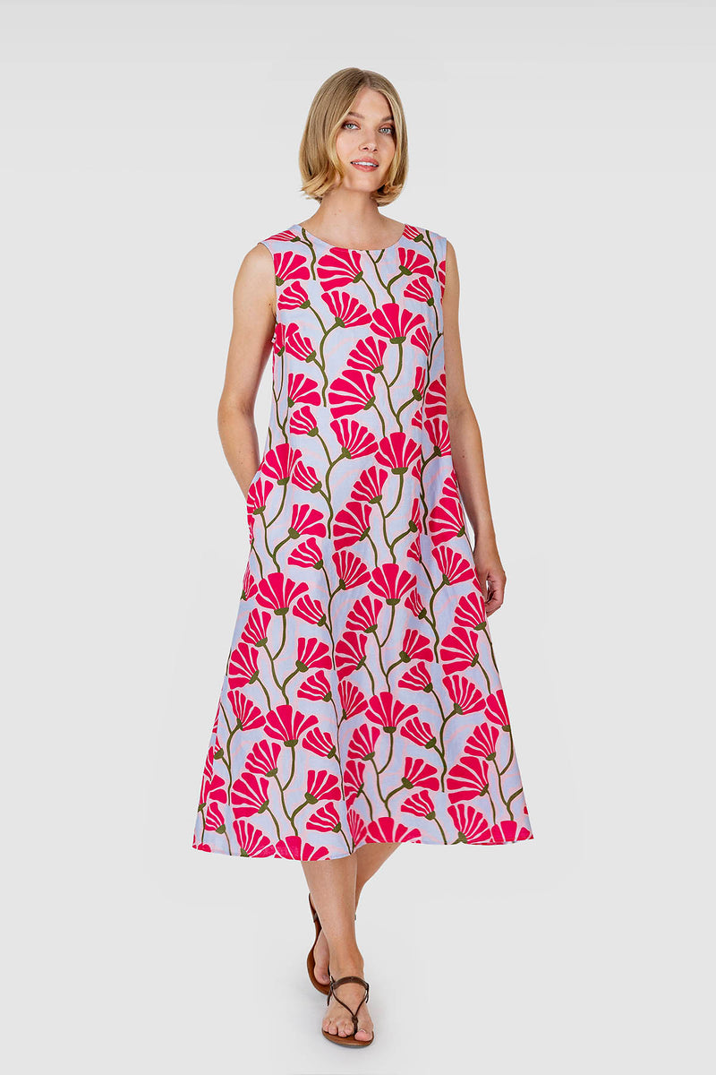 Pink flowers bloom in the summery and festive KURJENPOLVI dress. The sleeveless, long dress is slender on the shoulders and widens to the hem. It has pockets in the side seams. The dress is made of beautifully draping printed linen-cotton fabric, which is garment washed, so it does not shrink and feels comfortably soft. KURJENPOLVI dress is designed in Finland and made in Lithuania.