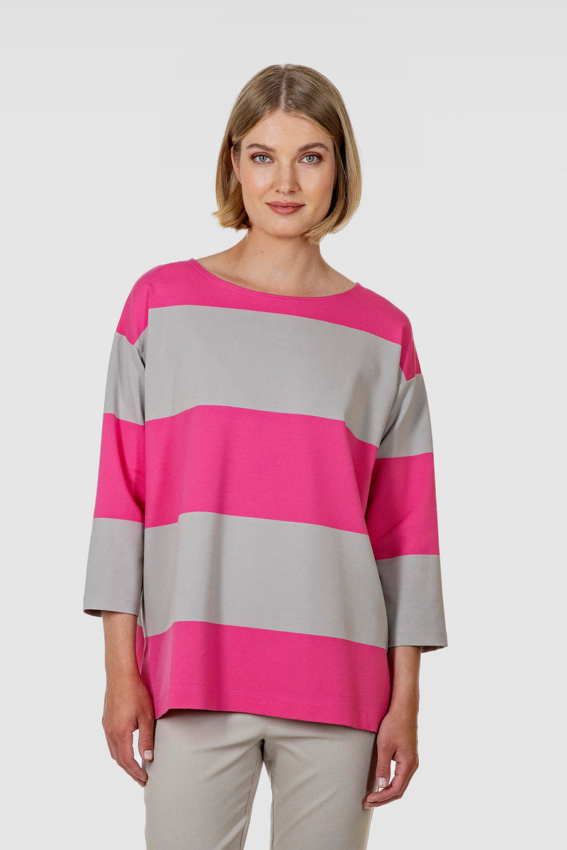 LORU top is relaxed and loose-fitting. It has a boat neckline, dropped shoulder seams, 3/4-length sleeves and slits in the side seams. It is made of pink-beige striped viscose jersey with some elastane to give stretch. The material feels very comfortable on the skin. LORU top is designed in Finland and made in Lithuania.