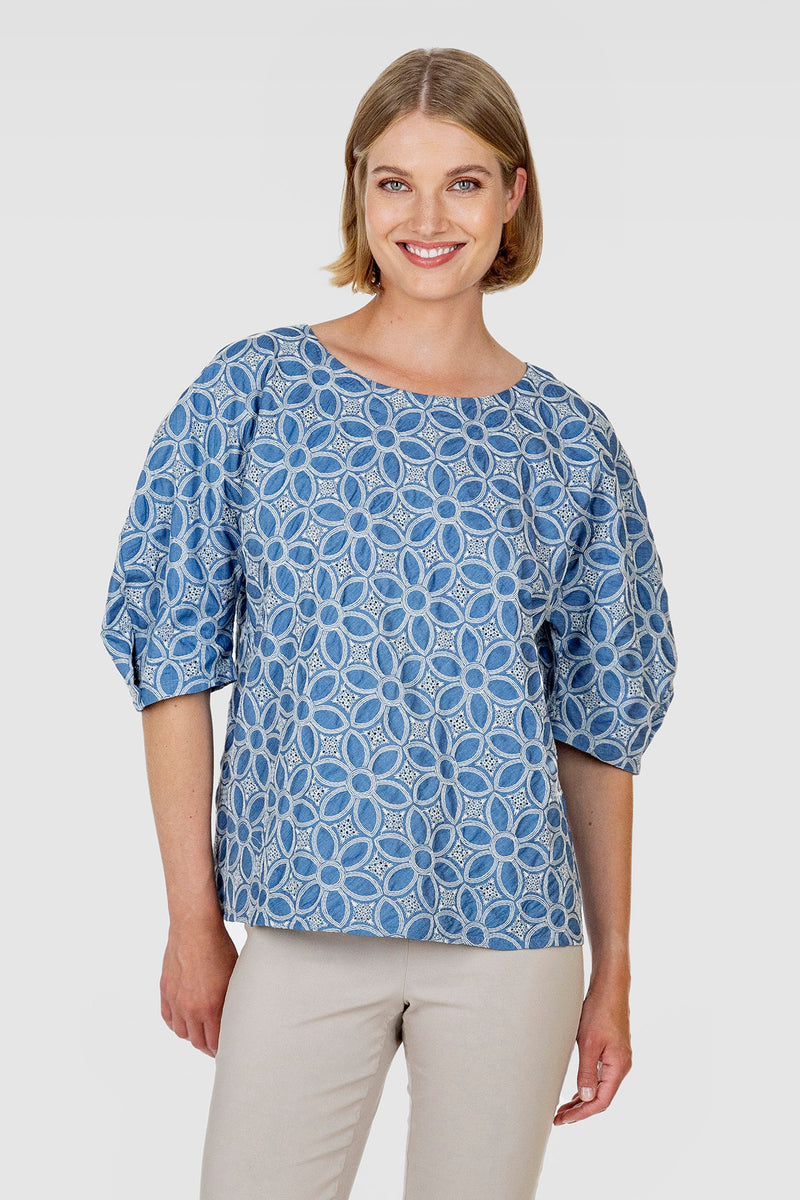MELBA top is made of a thin cotton denim fabric embroidered with graphic flowers in off-white. The short top has a round neckline, curved and baggy sleeves that extend above the elbows and a pleat at the cuffs. MELBA top is designed in Finland and made in Estonia.