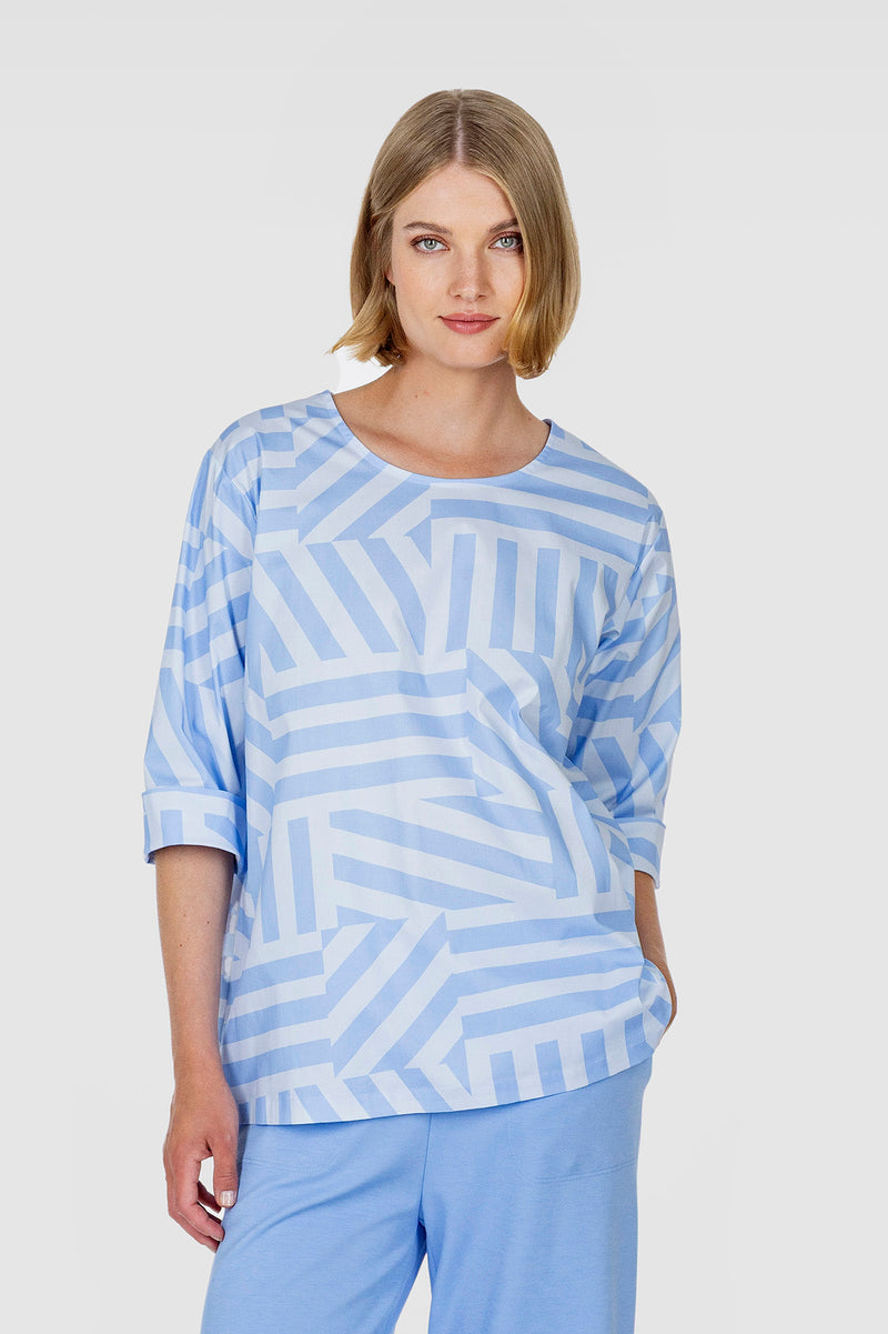 MIINUS top is made of high-quality and pleasantly soft printed cotton fabric with a little elastane to give stretch. The blue-toned Suuntaraita print is designed by Pihla Prittinen. The fairly loose-fitting top widens slightly to the hem and has a round neckline. The sleeves, which extend above the elbows, have wide turn-ups that can be used to adjust the length of the sleeves. MIINUS shirt is designed in Finland and made in Estonia.