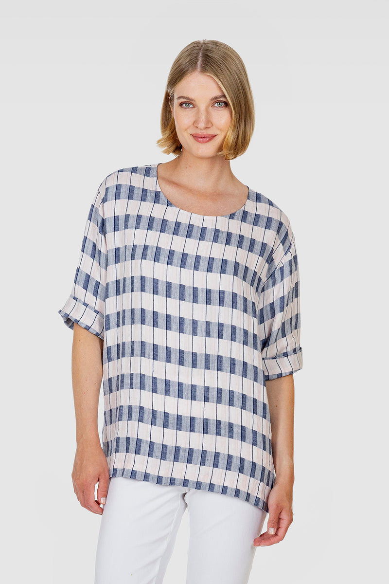 SOLA top is made of beautifully draping linen fabric with a refined pink and blue striped pattern woven into it. It is garment washed, so it  does not shrink and feels comfortably soft. The loose-fitting boxy top has a round neckline and slits at the sides. The sleeves have wide turn-ups that allow them to be turned up shorter. SOLA top is designed in Finland and made in Lithuania.