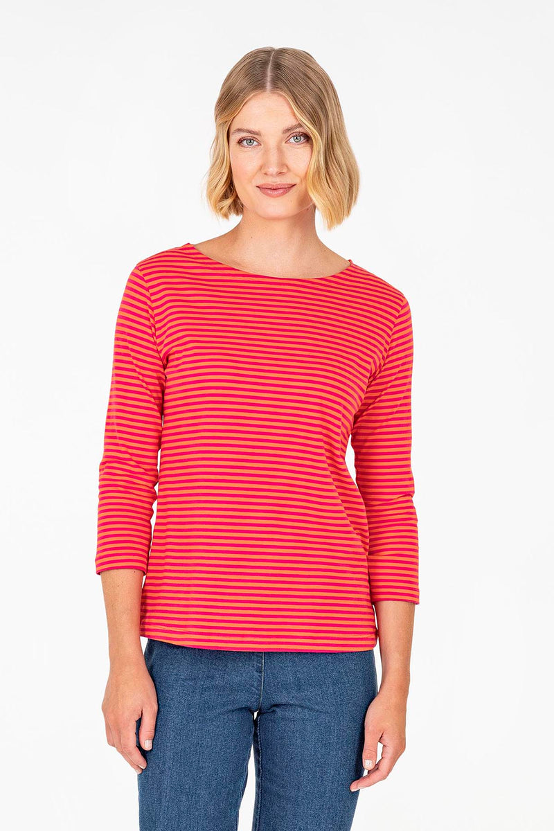 The pink-orange striped UNA top is a versatile classic. It is made of soft 100% cotton jersey that feels pleasant against the skin. The top has a slightly rounded boat neck and 3/4-length sleeves. UNA top is designed in Finland and made in Portugal.